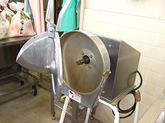 野菜を切る機械です。でも、この機械に入らない野菜は切ることができません。機械を使えないときは、調理員さんが、全部、包丁で切っています。